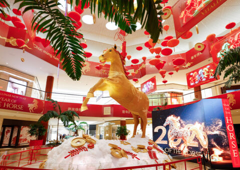 Poised atop sculpted clouds, the horse conveys elevation and majesty, while surrounding auspicious symbols express wishes for prosperity, success, and positive energy in the year ahead. Gold coins, ingots, and traditional Lunar New Year elements — including the lucky knot and firecrackers — are woven throughout the installation, with the Fire element thoughtfully integrated into the design.