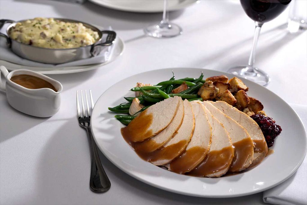 Morton’s is serving a four-course Thanksgiving feast in addition to the full menu. Start with butternut squash bisque with cinnamon crème fraîche. Next, a fall harvest salad with arugula, fennel, Honeycrisp apple, pomegranate, spiced walnut, goat cheese and maple vinaigrette.  The entrée is oven-roasted turkey roulade with savory sage & cranberry stuffing, turkey gravy, sour cream mashed potatoes, Morton’s green bean casserole and fresh cranberry sauce. End the feast with pecan streusel cheesecake with salted caramel and bourbon cream.
