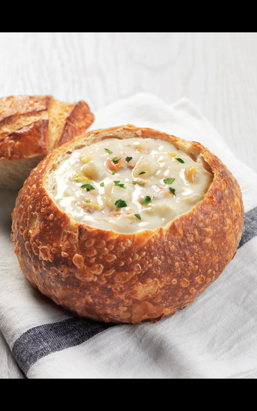The best seller, served in a freshly baked sourdough bread bowl, was made popular at Fisherman’s Wharf in San Francisco. It’s filled with clams and potatoes, a whisper of pepper and sprinkling of parsley.